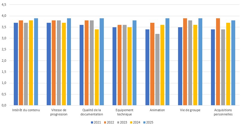 En 2021, 2022, 2023, 2024 et 2025 les niveaux de satisfaction des apprenants sur les formations 2LFCE ont été les suivants :